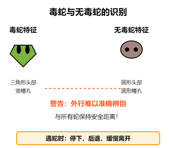 中国常见的毒蛇主要有五步蛇、竹叶青、眼镜蛇等。毒蛇通常头部呈三角形,瞳孔为竖直状,而无毒蛇多为圆形头部,瞳孔呈圆形。但切记,外行人很难准确辨别,最好的方法就是与所有蛇类保持距离!遇到蛇时,不要惊慌,缓慢后退,给蛇留出逃跑的空间。
