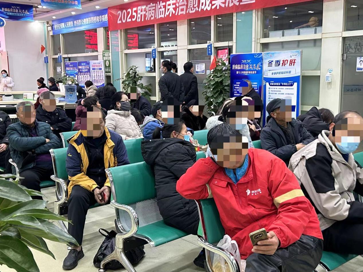 济南京坛肝病医院大厅内多名患者在有序候诊