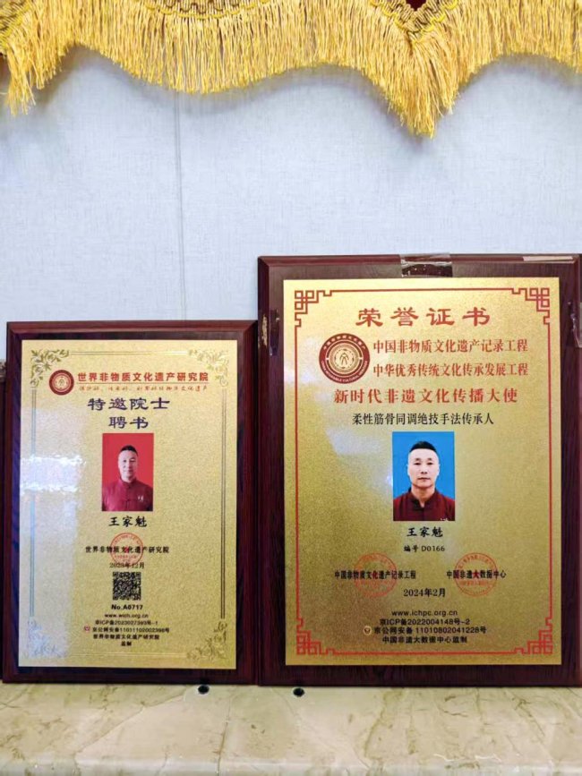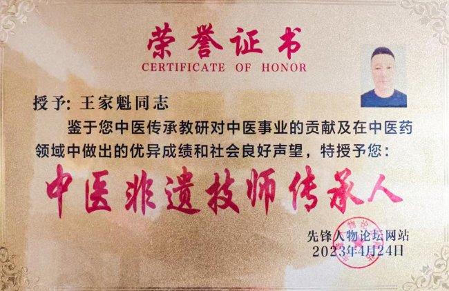 王家魁的努力也获得了社会的广泛认可。他被中国非物质文化遗产记录工程、中华优秀传统文化传承发展工程授予“新时代非遗文化传播大使,柔性筋骨同调绝技手法传承人”称号;其经营的北京佳奎鸿运来国医馆也被授予“企业信用评价3A级信用企业”。