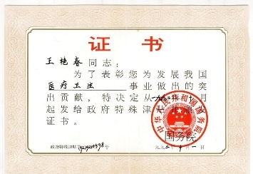 多年来王艳春始终重视学习经典著作和历代医家的经验,不断探索中医诊疗新方法。在市中心医院工作期间,她先后与中医科、肩周炎科的同志们一起奋战,通过中医特色疗法治疗患者,她专家门诊日接诊量高峰时达80余人次,多年的临床一线奋斗,她为医院为患者付出很多,也得到了高度的认可,为了表彰王艳春为发展我国医疗卫生事业做出的突出贡献,国务院颁发证书授予她自1992年10月起享受中华人民共和国国务院颁发的政府特殊津贴。
